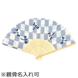 淡い青の市松模様にトンボが舞うデザインが描かれた冷涼感たっぷりの白竹扇子。トンボが水紋を立てて舞う、涼し気な情景が思い浮かびます。性別を問わず使用できて、販促ノベルティに最適です。