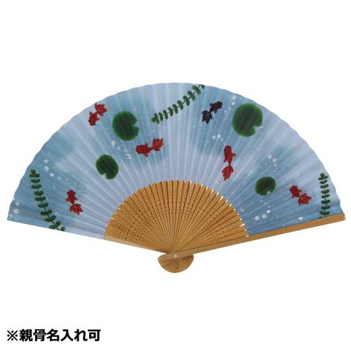淡い色彩の水面にスイスイと泳ぐ金魚の姿が描かれている扇子です。100本からの販売なので、販促ノベルティとしてお求め頂きやすい商品となっております。